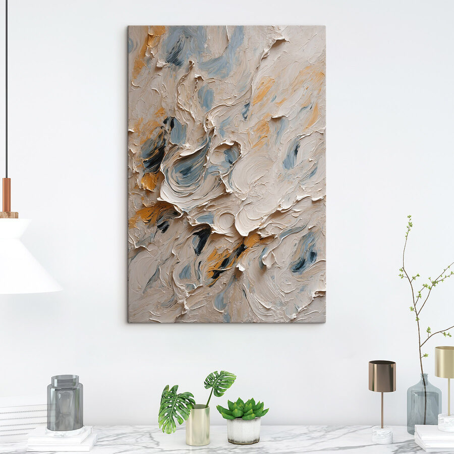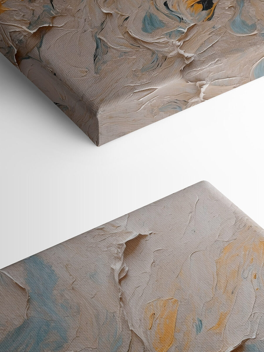 Mit diesem atemberaubenden Leinwanddruck, auf dem Farben und Texturen einen wunderlichen Tanz aufführen, können Sie jede Wand verschönern. Stellen Sie sich vor, Sie sitzen auf dem Sofa, eine dampfende Tasse Kaffee in der Hand, während die sanften Blautöne und warmen Farben eine einladende Atmosphäre schaffen. Es ist wie eine kuschelige Decke für Ihre Wände! Dieses abstrakte Werk bringt Leben und einen Hauch von Faszination in Ihren Raum und regt Gespräche und Tagträume gleichermaßen an. Jeder Blick offenbart etwas Neues und macht es zu einem unendlich faszinierenden Hintergrund für die täglichen Momente. Perfekt, um eine langweilige Ecke aufzuhellen oder einer Galeriewand einen Hauch von Kreativität zu verleihen.