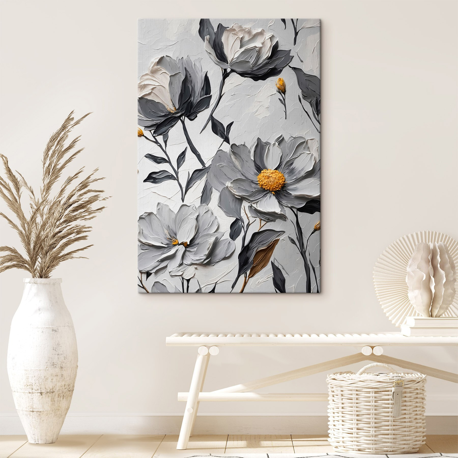 Verschönern Sie jede Ecke mit diesem hübschen Leinwanddruck, der anmutige Blumen auf einem zarten weißen Hintergrund zeigt. Es ist, als würde man einen Garten ins Haus holen, nur ohne die Allergien! Die sanften Farbtöne harmonieren perfekt und schaffen eine ruhige Atmosphäre, die einfach gut tut. Stellen Sie sich vor, Sie schlürfen einen Kaffee und vergessen die Zeit, während Sie die üppigen Blütenblätter betrachten. Perfekt für ein Wohnzimmer oder eine gemütliche Leseecke – dieses Stück strahlt Eleganz und Wärme aus. Außerdem sorgt es für Gesprächsstoff – Ihre Freunde werden sich fragen, ob Sie gerade einen Blumenurlaub gemacht haben! Ein kleines Stück Natur direkt an Ihrer Wand.