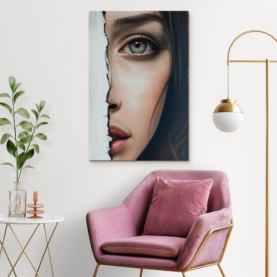 Dieser Leinwanddruck, der ein markantes Frauengesicht mit dem Effekt von zerrissenem Papier zeigt, verleiht jedem Raum eine einzigartige Note. Es sieht aus, als würde sie durch eine geheime Tür spähen, die zu Neugier und Gesprächen einlädt. Stellen Sie sich das Bild in einem gemütlichen Wohnzimmer vor – Ihre Freunde werden es mit Sicherheit bewundern und vielleicht sogar ihre eigenen Geschichten erzählen. Der Kontrast zwischen den lebendigen Zügen und der rauen Kante verleiht dem Bild eine gewisse Dramatik und schafft eine emotionale Verbindung. Perfekt für alle, die Kunst zu schätzen wissen, die eine Geschichte erzählt. Dieses Stück verleiht einen Hauch von Intrige und Persönlichkeit, ohne zu übertrieben zu sein. Es ist mehr als nur Dekoration; es ist eine Stimmung und ein Moment, der in der Zeit festgehalten wurde.