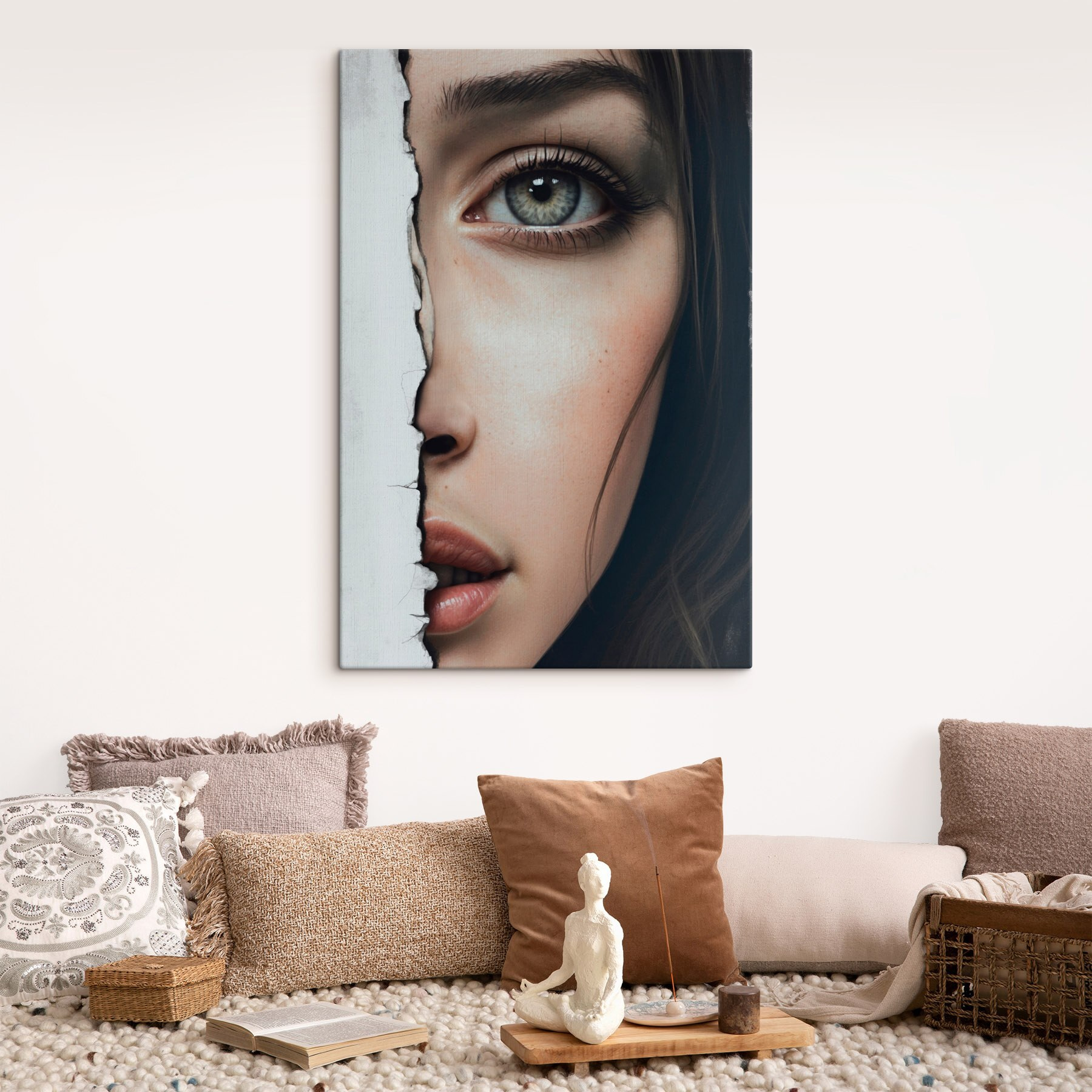 Dieser Leinwanddruck, der ein markantes Frauengesicht mit dem Effekt von zerrissenem Papier zeigt, verleiht jedem Raum eine einzigartige Note. Es sieht aus, als würde sie durch eine geheime Tür spähen, die zu Neugier und Gesprächen einlädt. Stellen Sie sich das Bild in einem gemütlichen Wohnzimmer vor – Ihre Freunde werden es mit Sicherheit bewundern und vielleicht sogar ihre eigenen Geschichten erzählen. Der Kontrast zwischen den lebendigen Zügen und der rauen Kante verleiht dem Bild eine gewisse Dramatik und schafft eine emotionale Verbindung. Perfekt für alle, die Kunst zu schätzen wissen, die eine Geschichte erzählt. Dieses Stück verleiht einen Hauch von Intrige und Persönlichkeit, ohne zu übertrieben zu sein. Es ist mehr als nur Dekoration; es ist eine Stimmung und ein Moment, der in der Zeit festgehalten wurde.
