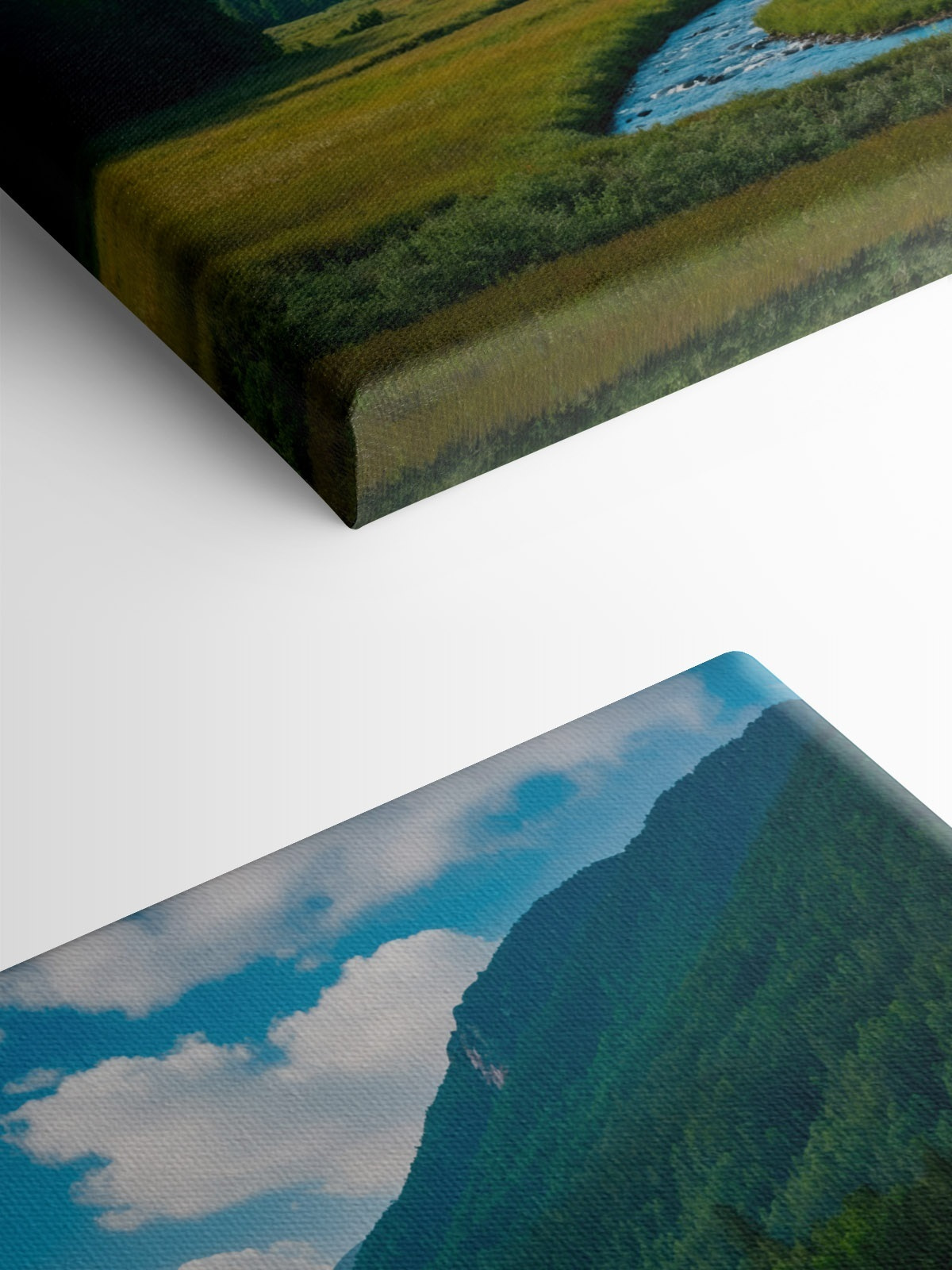 Stellen Sie sich vor, Sie verwandeln Ihren Raum in einen ruhigen Zufluchtsort mit diesem atemberaubenden Leinwanddruck. Das Leinwandbild “Fluss, der durch ein Tal fließt, mit Bergen im Hintergrund” fängt die Essenz der Natur wunderschön ein. Stellen Sie sich vor, wie es an Ihrer Wand hängt und einen Hauch von frischer Luft direkt in Ihr Wohnzimmer bringt. Jeder Blick auf den sich schlängelnden Fluss zwischen üppigen Bäumen könnte Sie auf eine friedliche Wanderung versetzen – ganz ohne Wanderschuhe. Es ist, als hätten Sie Ihr eigenes kleines Stückchen Natur, das Sie zu Tagträumen von Wochenendabenteuern oder gemütlichen Abenden inspiriert. Perfekt für jeden Naturliebhaber, verleiht dieses Stück jedem Raum Tiefe und Charakter und lädt zu Wärme und Ruhe ein. Wer würde nicht gerne mit dieser Aussicht nach Hause kommen?