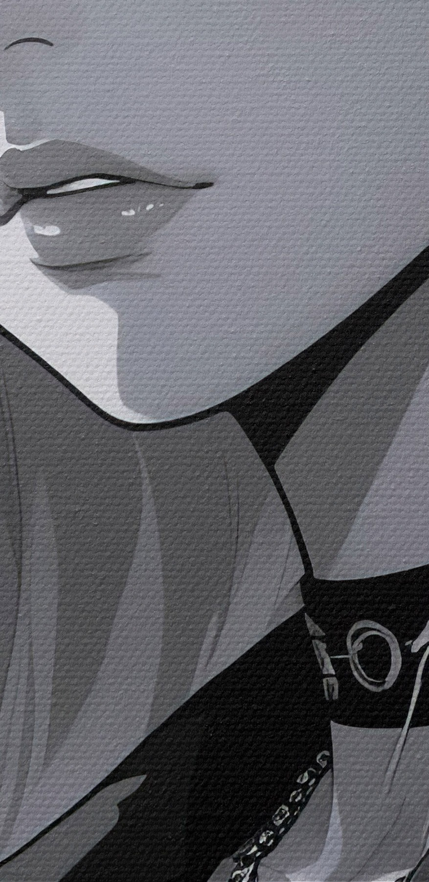 Verleihen Sie Ihrem Raum einen Hauch von Coolness mit diesem auffälligen Leinwandbild. Es zeigt eine bezaubernde Frau mit langen, wallenden blonden Haaren und Kopfhörern, die Eleganz und einen Hauch von Haltung perfekt miteinander verbindet. Stellen Sie sich vor, wie sie Ihnen über die Schulter schaut, während Sie Ihren Kaffee trinken, als ob sie all Ihre geheimen Träume mitbekommt. Das schwarz-weiße Design verleiht ihr eine zeitlose Ausstrahlung und passt in jeden Raum, vom schicken Wohnbereich bis zum kreativen Arbeitsbereich. Es ist, als hätte man ein kleines Kunstwerk, das Stil ausstrahlt, ohne nach Aufmerksamkeit zu schreien. Perfekt für alle, die ein wenig Frechheit in ihrer Einrichtung zu schätzen wissen.