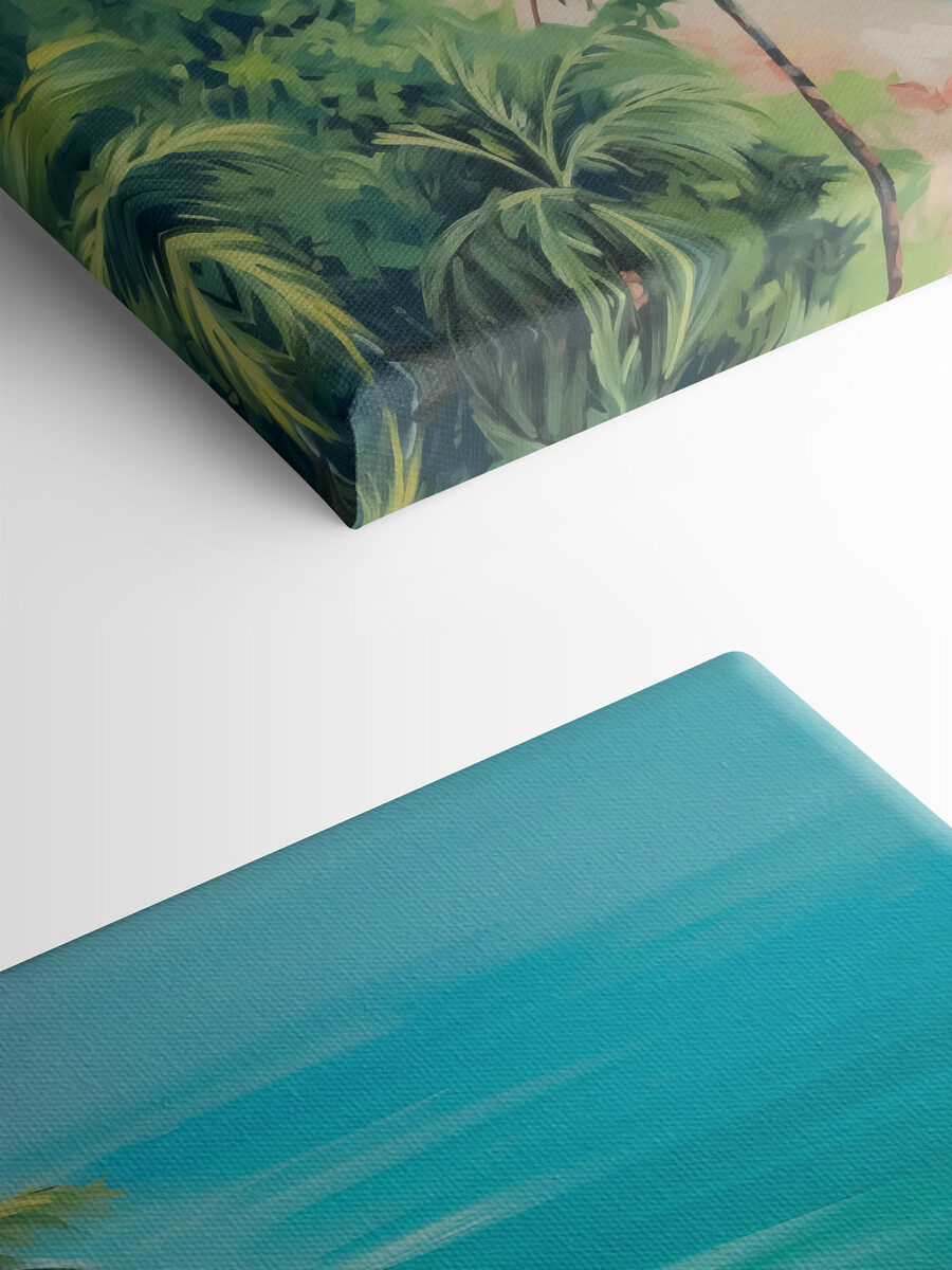 Holen Sie sich ein Stück Paradies nach Hause mit diesem lebendigen Leinwanddruck einer Strandszene, die einfach nur nach Entspannung schreit. Stellen Sie sich vor, wie Sie sich mit einem kühlen Getränk in der Hand in Ihren Lieblingssessel sinken lassen, während sich die Palmen wiegen und die Wellen des Ozeans Sie zur Flucht einladen. Dieses Kunstwerk steht nicht einfach nur da, es belebt den Raum und verwandelt die Wände in Fenster der Ruhe. Ob im Wohnzimmer oder in einer gemütlichen Ecke, es wird Ihnen jeden Tag das Gefühl geben, im Urlaub zu sein. Wer weiß – vielleicht inspiriert es Sie zu einem Strandurlaub oder zwei!