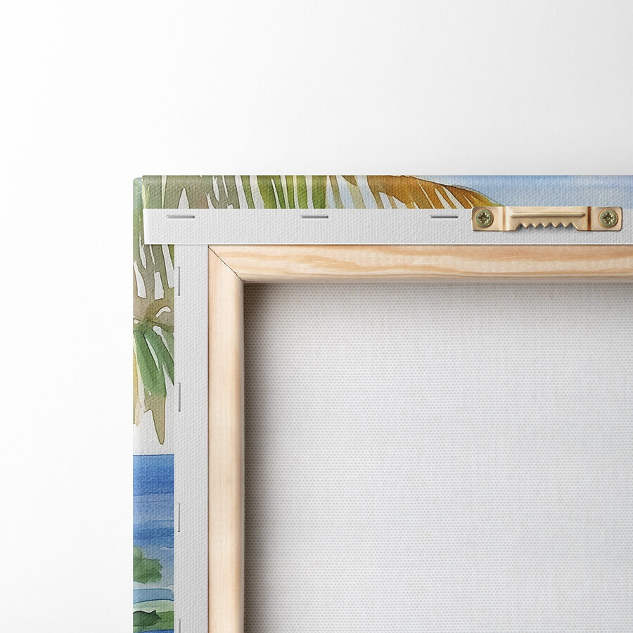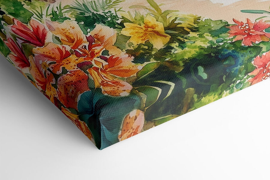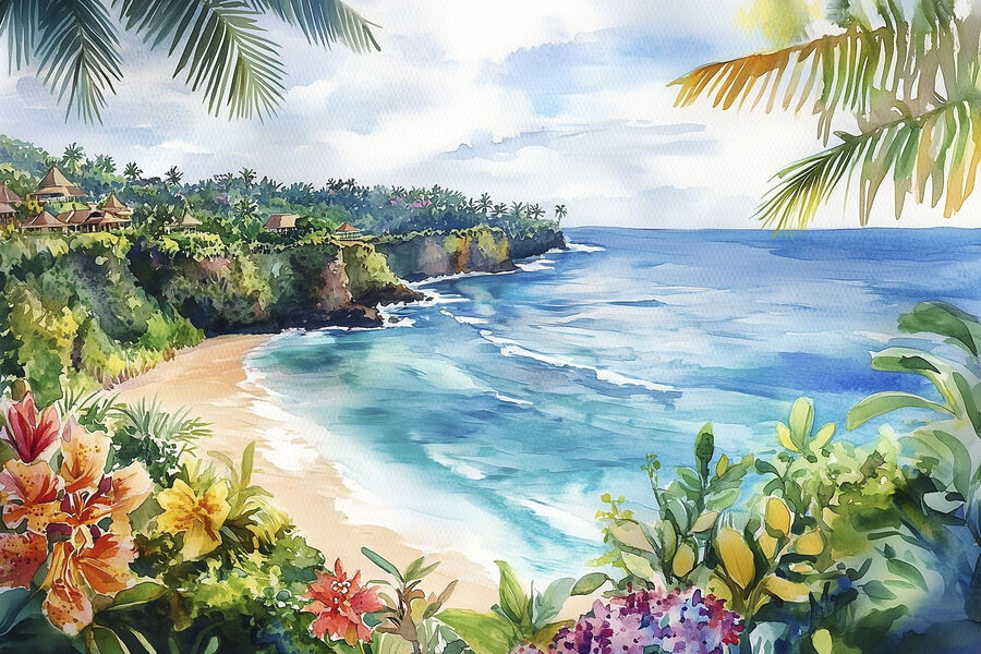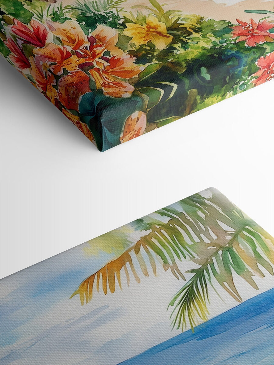 Mit diesem wunderschönen Aquarell einer Strandszene verwandeln Sie jede Wand in einen Miniatururlaub. Stellen Sie sich lebhafte, farbenfrohe Blumen neben sanften, rollenden Wellen vor – Ihr Zimmer wird nicht wissen, was es getroffen hat! Stellen Sie sich vor, wie Sie sich in Ihren Lieblingssessel sinken lassen, eine Tasse mit etwas Warmem in der Hand, während dieses Kunstwerk Sie an die Sandstrände entführt. Es ist wie eine Palmenparty an der Wand, nur ohne den Sand in den Schuhen. Perfekt, um einen Hauch von Natur in Ihren Raum zu bringen und jederzeit Tagträume von einem Urlaub an der Küste zu wecken.