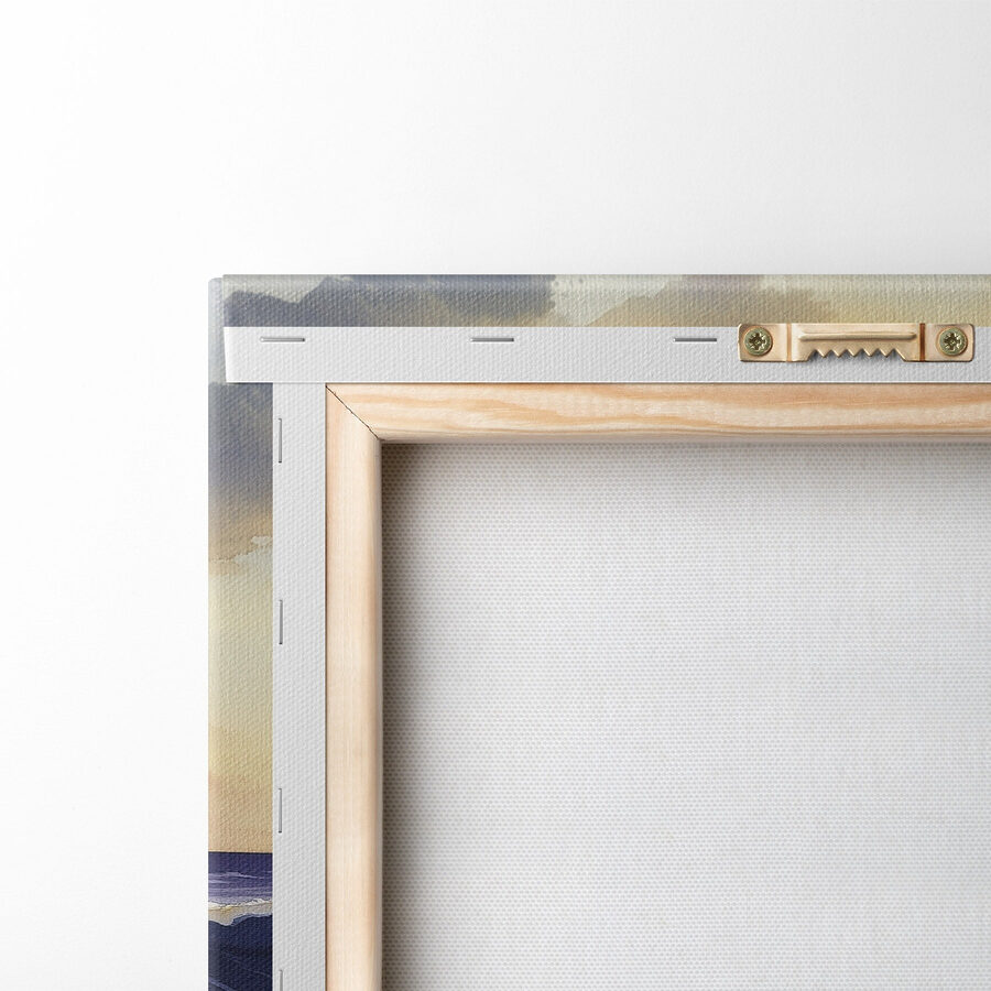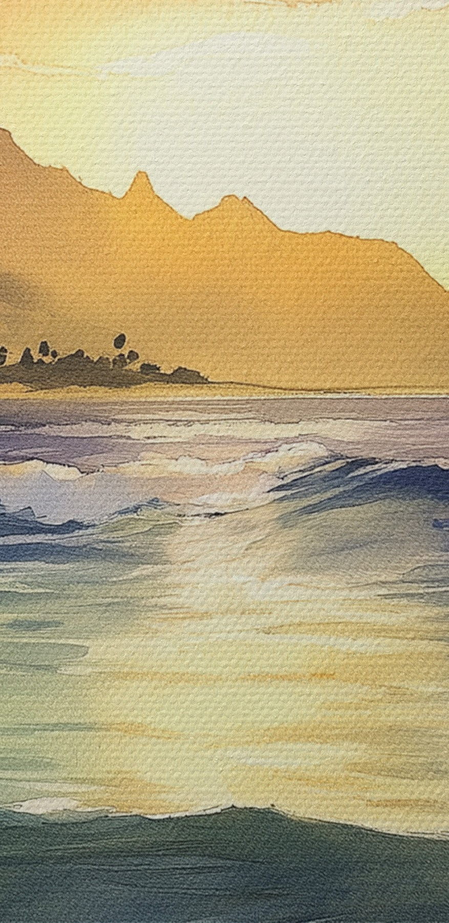 Tauchen Sie Ihren Raum in die heitere Atmosphäre dieses Aquarells mit sanften Wellen und majestätischen Bergen. Stellen Sie sich vor: eine gemütliche Ecke, in der die sanften Farbtöne des Kunstwerks Sie an einen Sonnenuntergang am Strand versetzen und Ihnen einen Moment der Flucht aus dem Alltag ermöglichen. Jedes Mal, wenn Sie den Raum betreten, ist es, als würden Sie einen kleinen Urlaub machen. Egal, ob es in einem Wohnbereich oder einem ruhigen Schlafzimmer aufgehängt wird, es lädt zu Tagträumen von Sandstränden und frischen Meeresbrisen ein. Die beruhigenden Blau- und Erdtöne schaffen Harmonie und sind die perfekte Ergänzung für alle, die sich ein Stück Natur ins Haus holen wollen.