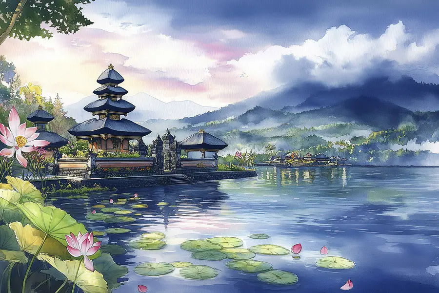 Stellen Sie sich dieses atemberaubende Aquarell eines ruhigen Sees vor, mit einer charmanten Pagode und anmutigen Seerosenblättern, die auf der Oberfläche tanzen. Es ist wie eine kleine Flucht vor dem Alltagslärm und perfekt geeignet, um jedem Raum ein Stückchen Gelassenheit zu verleihen. Stellen Sie sich vor, Sie machen es sich mit einer Tasse Tee gemütlich und lassen die friedliche Stimmung auf sich wirken. Die sanften Farbtöne und verträumten Details laden zum Träumen ein und wecken Tagträume von fernen Ländern und sanften Brisen. Diese Leinwand ist nicht nur Dekoration, sie ist ein Fenster in eine andere Welt. Ihr Raum hat ein solches Stück verdient – warum nicht auch Sie?