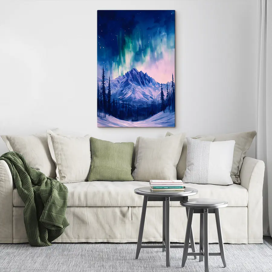Stellen Sie sich vor, es ist ein gemütlicher Abend, vielleicht haben Sie eine Tasse Chai in der Hand, und plötzlich werden Sie in eine magische Berglandschaft unter einem tanzenden Polarlicht versetzt. Dieser Leinwanddruck tut genau das. Die leuchtenden Blau- und Grüntöne wirbeln über schneebedeckten Gipfeln, während die Bäume wie stille Wächter aufrecht stehen. Es ist perfekt für jeden, der davon träumt, in die Natur zu entfliehen, und sei es nur von der Couch aus. Stellen Sie sich vor, wie es jede Wand aufpeppt, Gespräche anregt oder einfach nur eine friedliche Kulisse für nachdenkliche Momente bietet. Die Schönheit der Natur, in Flaschen abgefüllt, nur für Sie.
