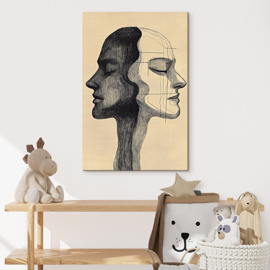 Treten Sie ein in eine Welt, in der Kunst auf Verbindung trifft, mit diesem fesselnden Leinwanddruck der Gesichter eines Mannes und einer Frau. Die verschlungenen Linien und starken Kontraste laden dazu ein, über die Geschichten hinter diesen Blicken nachzudenken. Es ist nicht nur Dekoration, sondern auch ein Gesprächsanlass. Stellen Sie sich dieses Stück an Ihrer Wand vor, das gemütliche Abende oder lebhafte Versammlungen bereichert. Freunde könnten sich davon angezogen fühlen und sich darüber unterhalten, was das Kunstwerk für sie bedeutet. Dieser Druck tanzt zwischen Abstraktion und Emotion und weckt bei jedem Blick Inspiration. Perfekt für jeden Ort in Ihrem Zuhause – geben Sie diesen Wänden eine Stimme!