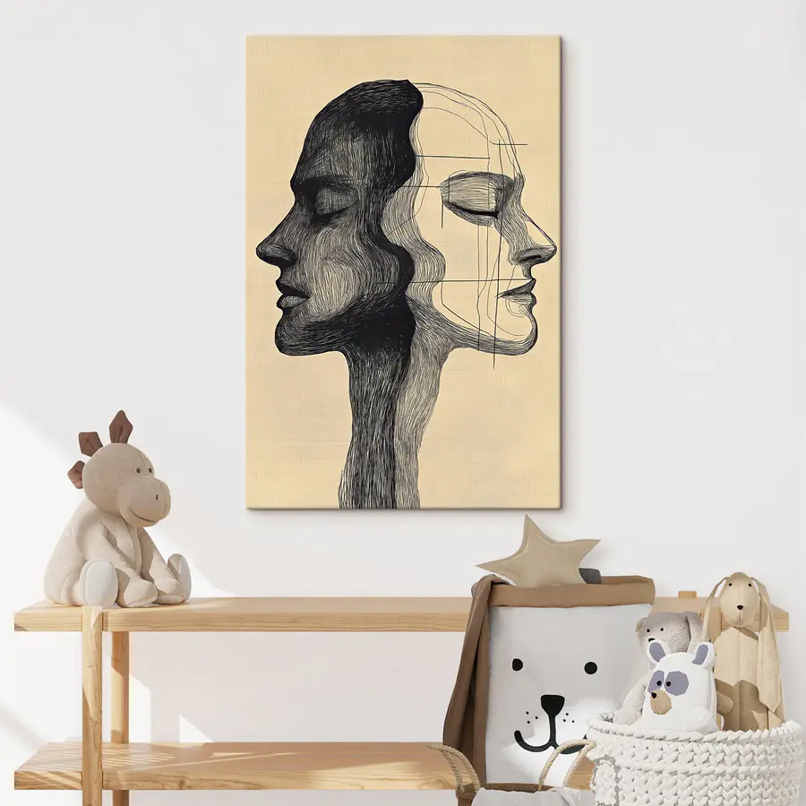 Treten Sie ein in eine Welt, in der Kunst auf Verbindung trifft, mit diesem fesselnden Leinwanddruck der Gesichter eines Mannes und einer Frau. Die verschlungenen Linien und starken Kontraste laden dazu ein, über die Geschichten hinter diesen Blicken nachzudenken. Es ist nicht nur Dekoration, sondern auch ein Gesprächsanlass. Stellen Sie sich dieses Stück an Ihrer Wand vor, das gemütliche Abende oder lebhafte Versammlungen bereichert. Freunde könnten sich davon angezogen fühlen und sich darüber unterhalten, was das Kunstwerk für sie bedeutet. Dieser Druck tanzt zwischen Abstraktion und Emotion und weckt bei jedem Blick Inspiration. Perfekt für jeden Ort in Ihrem Zuhause – geben Sie diesen Wänden eine Stimme!