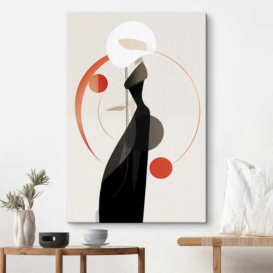Mit diesem Leinwandbild ist es jetzt noch einfacher, eine Wand in einen Gesprächsanlass zu verwandeln! Stellen Sie sich eine schicke Frau in einem eleganten schwarzen Kleid und einem skurrilen weißen Hut vor, perfekt in Szene gesetzt vor einem weichen Hintergrund. Die kühnen Farbkreise verleihen dem Bild eine verspielte Note und machen es ideal für jeden Raum, der einen Hauch von Persönlichkeit gebrauchen kann. Stellen Sie sich vor, Sie schlürfen einen Kaffee, während Sie einen Blick auf dieses Kunstwerk erhaschen – als hätten Sie einen modischen Freund, der immer beeindruckend gekleidet ist! Perfekt für minimalistische Stimmung oder einen Hauch von künstlerischem Flair, lädt es zum Lächeln ein und ergänzt jede Einrichtung.