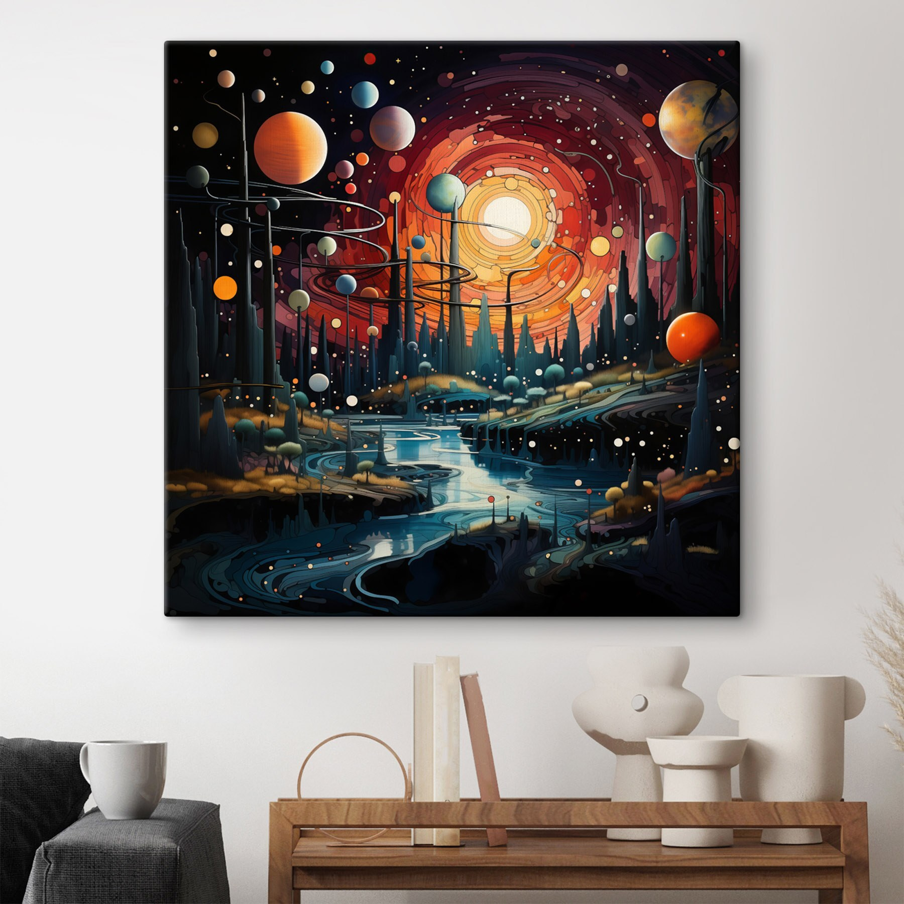 Verwandeln Sie Ihren Raum mit einem wilden Spritzer kosmischen Charmes. Dieser Leinwanddruck einer atemberaubenden Landschaft mit bunten Planeten und skurrilen Bäumen lädt zu Tagträumen von Abenteuern im Sternenhimmel ein. Stellen Sie sich vor, es hängt in Ihrem Wohnzimmer – Gäste kommen herein, machen große Augen und werden sofort in eine andere Welt versetzt. Die leuchtenden Farben tanzen miteinander und verführen zu einer Ode an das große Unbekannte. Es ist, als hätten Sie ein kleines Stück des Universums direkt an Ihrer Wand. Ein perfekter Gesprächsanlass oder einfach eine Erinnerung daran, seine Träume groß und seine Sorgen klein zu halten. Was gibt es da nicht zu lieben?