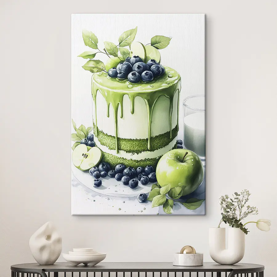 Verschönern Sie Ihren Raum mit diesem köstlichen Leinwandbild, das einen leckeren Kuchen mit grünem Zuckerguss und saftigen Äpfeln zeigt. Es ist, als hätte man ein Dessert direkt an der Wand, nur ohne die Kalorien – Gott sei Dank! Stellen Sie sich vor, Sie betreten einen Raum, sehen dieses Kunstwerk und fühlen eine Welle der Freude. Es eignet sich perfekt für Küchen oder Essbereiche und regt zu Gesprächen an und macht vielleicht sogar Lust auf Kuchen. Die leuchtenden Farben und das verspielte Design laden einfach zum Lächeln ein und bringen Wärme und einen Hauch von Laune in jede Ecke. Ein Stückchen Glück, das Sie auf jeden Fall um sich haben wollen.