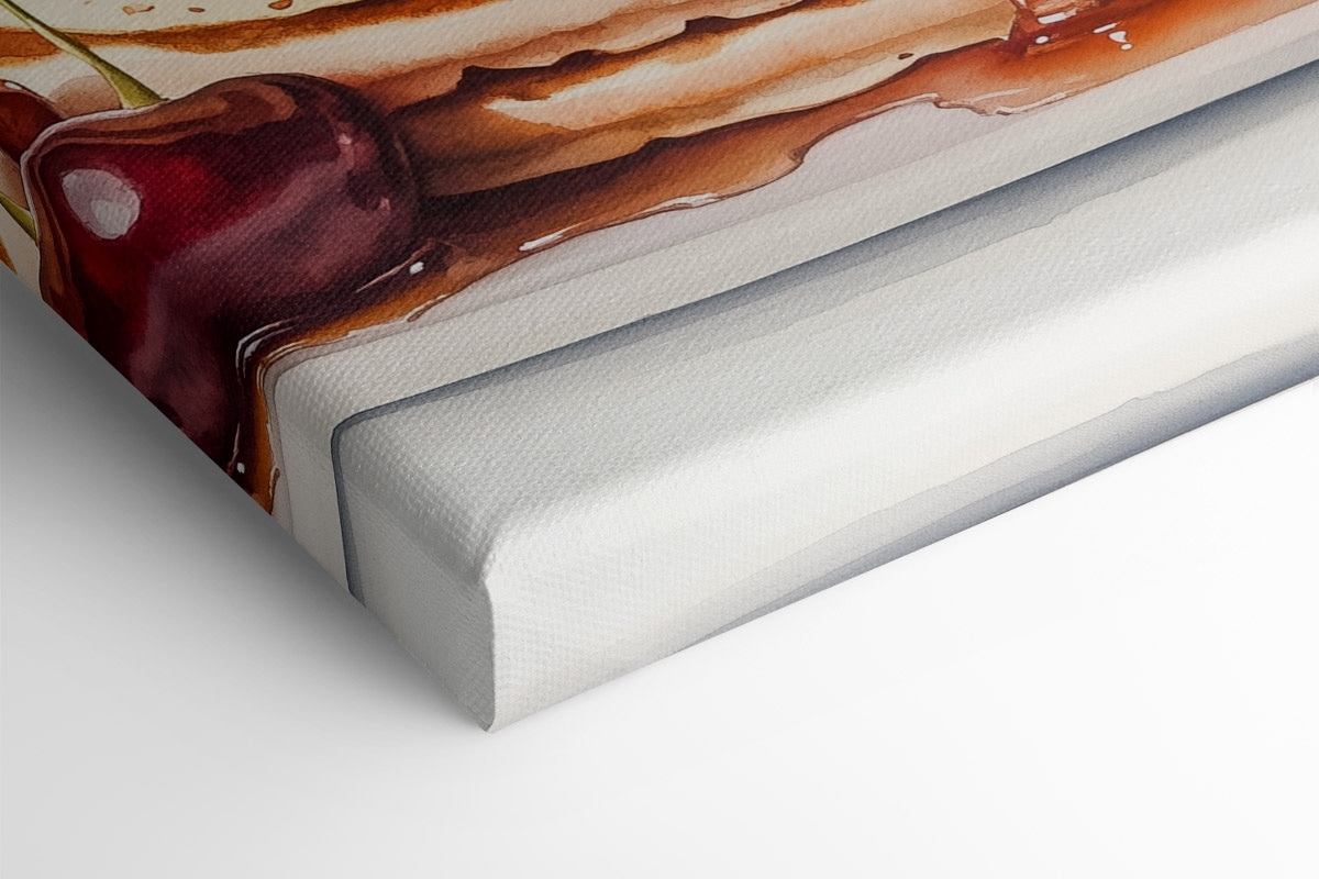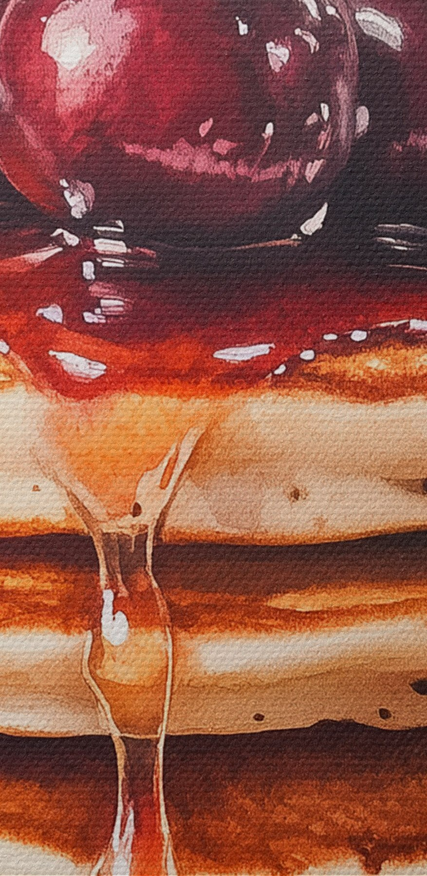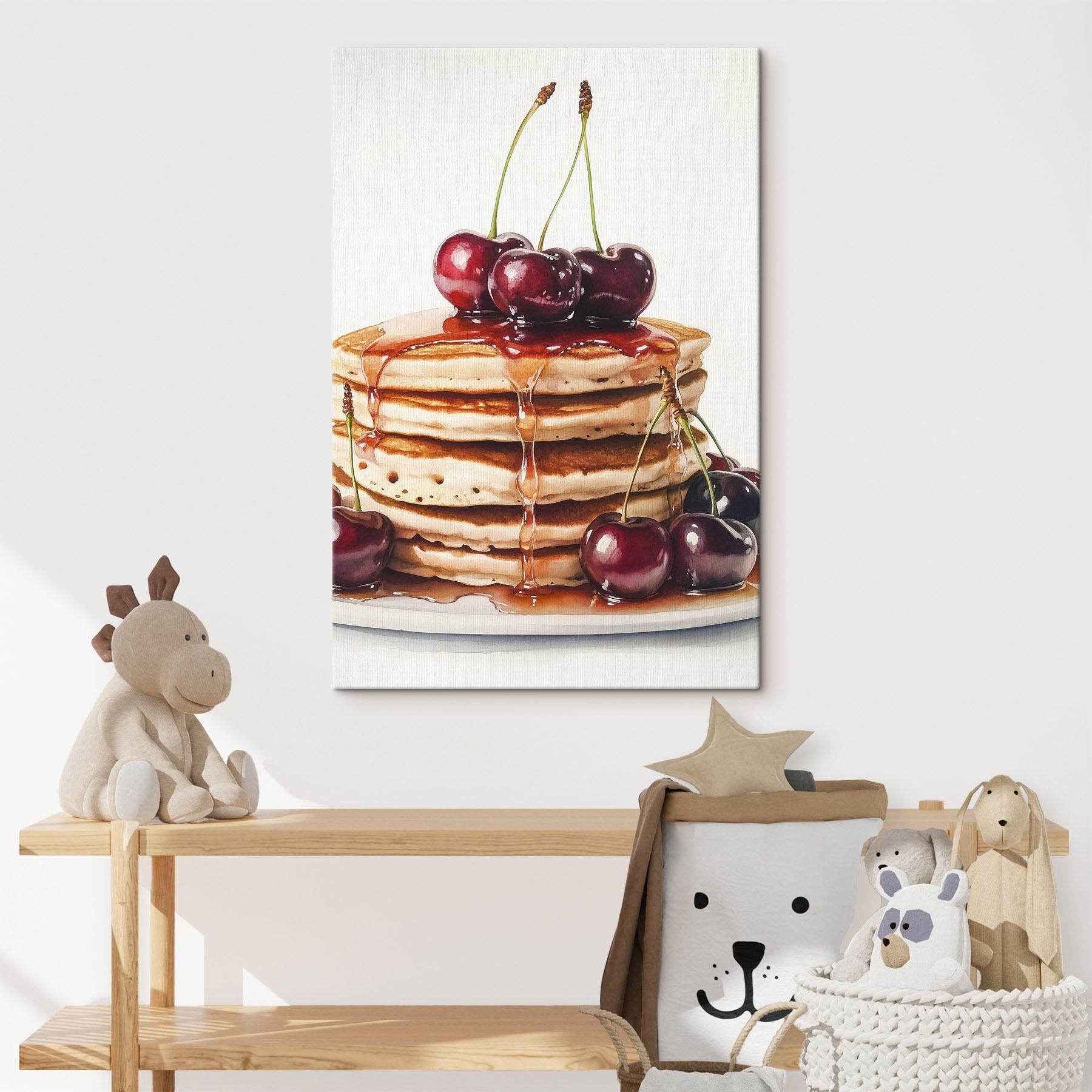 Tauchen Sie ein in die köstliche Welt des Frühstücks mit diesem Leinwanddruck, der einen Stapel fluffiger Pfannkuchen zeigt, die mit saftigen Kirschen gekrönt sind. Stellen Sie sich vor, dieses Bild in einer gemütlichen Küche oder Essecke aufzuhängen, wo es sofort zu Gesprächen und vielleicht sogar zu Heißhungerattacken anregt. Es ist schwer, nicht über die glitzernden Kirschen und den tropfenden Sirup zu schmunzeln – wer würde da nicht gerne zugreifen? Dieses lebendige Kunstwerk verleiht dem Essen eine spielerische Note und macht es zu etwas Besonderem. Perfekt für Essensliebhaber oder alle, die ihren Raum mit einem Stück süßen Charme verschönern wollen – es ist, als würde man das Frühstück einladen, für immer zu bleiben!