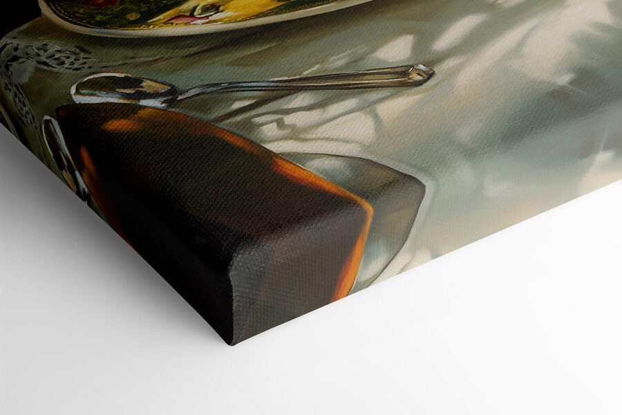 Stellen Sie sich vor, dass Ihre Küche oder Ihr Esszimmer mit lebendigen Aromen belebt wird, eingefangen in einem atemberaubenden Leinwanddruck, der einen köstlichen Aufstrich aus Sandwiches und saftigem Obst zeigt. Dieses Kunstwerk erinnert an sonnige Brunches, bei denen man frische Sandwiches und Orangenscheiben mit Lachen und guter Gesellschaft genießt. Das üppige Grün im Hintergrund erinnert an Sommertage im Freien, vielleicht mit einem erfrischenden Getränk in der Hand. Es ist wie eine gemütliche Umarmung für Ihre Wände – perfekt, um Gespräche anzuregen und jede Mahlzeit zu etwas ganz Besonderem zu machen. Warum also nicht diesen Farbklecks in Ihren Alltag einfließen lassen?