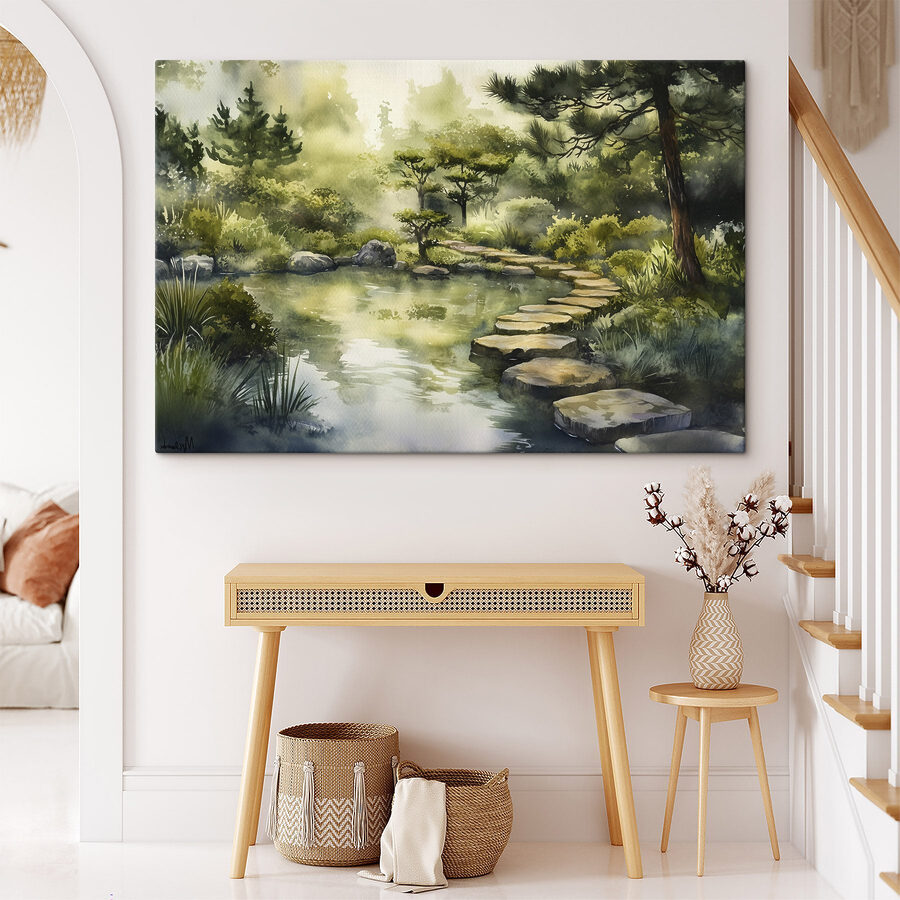 Verwandeln Sie Ihren Raum mit diesem bezaubernden Aquarellbild eines ruhigen Weges, der zu einem stillen Teich führt. Stellen Sie sich vor, dass Sie jedes Mal, wenn Sie es betrachten, durch ein Waldwunderland gleiten! Die sanften Grün- und Blautöne sorgen für eine friedliche Atmosphäre und machen das Bild perfekt für eine gemütliche Leseecke oder ein lebhaftes Wohnzimmer. Stellen Sie sich vor, wie Ihre Freunde stehen bleiben, um es zu bewundern, und sagen, dass es sich anfühlt, als würden Sie in ein Märchenbuch treten. Jeder Pinselstrich lädt zu Tagträumen von friedlichen Fluchten ein und weckt ein Gefühl der Ruhe, das sich wie eine kuschelige Decke um Sie legt. Holen Sie sich die Schönheit der Natur ins Haus!