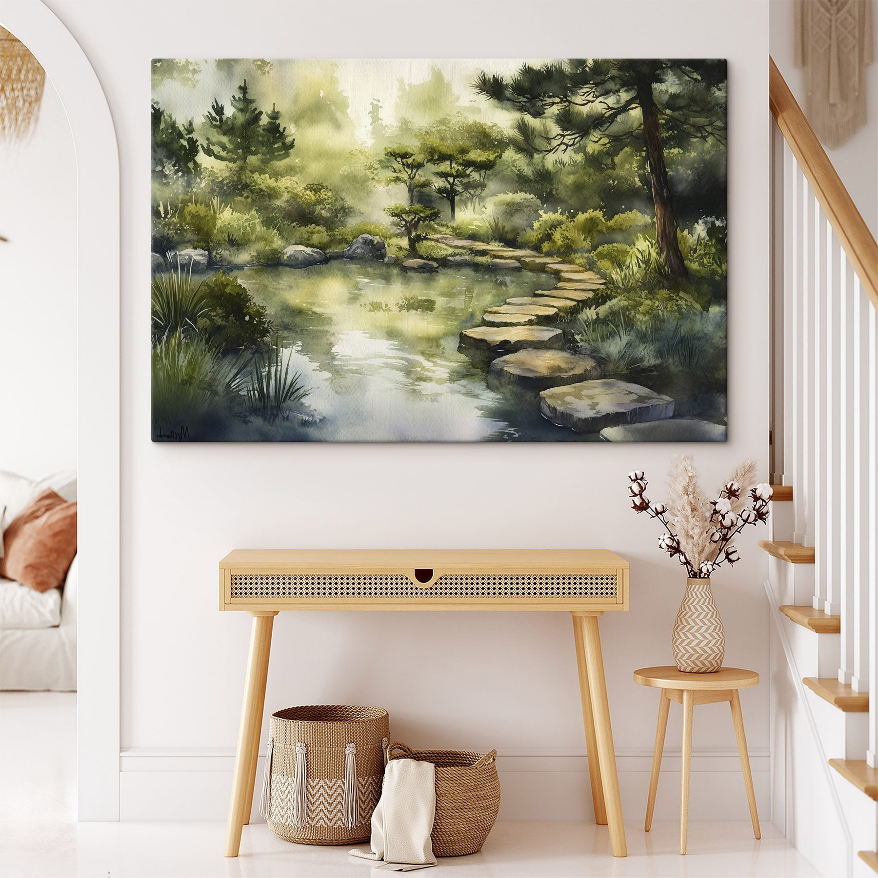Verwandeln Sie Ihren Raum mit diesem bezaubernden Aquarellbild eines ruhigen Weges, der zu einem stillen Teich führt. Stellen Sie sich vor, dass Sie jedes Mal, wenn Sie es betrachten, durch ein Waldwunderland gleiten! Die sanften Grün- und Blautöne sorgen für eine friedliche Atmosphäre und machen das Bild perfekt für eine gemütliche Leseecke oder ein lebhaftes Wohnzimmer. Stellen Sie sich vor, wie Ihre Freunde stehen bleiben, um es zu bewundern, und sagen, dass es sich anfühlt, als würden Sie in ein Märchenbuch treten. Jeder Pinselstrich lädt zu Tagträumen von friedlichen Fluchten ein und weckt ein Gefühl der Ruhe, das sich wie eine kuschelige Decke um Sie legt. Holen Sie sich die Schönheit der Natur ins Haus!