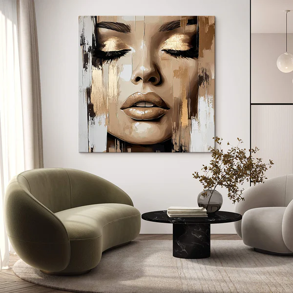Neutraler Grundton, Akzent über Hauttöne. Ergänzen Sie mit Aquarell oder Abstrakt als ruhige Begleiter. Schwarzweiß passt ideal zu Metall, Stein und Architektur.